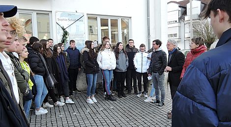 Bürgermeister Helmut Himmler erinnerte die Schüler der zwei 9. Klassen am Sophie-Scholl-Platz an den Todestag am 22. Februar 1943.
