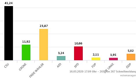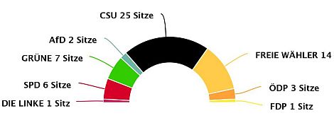Die CSU erhält demnach 25 Sitze (28), die Freien Wähler kommen auf 15 Sitze (16), die Grünen auf 7 (6), die SPD auf 6 (9), die ÖDP auf drei, die AfD auf zwei Sitze und die Linke und die FDP (1) auf je einen Sitz.