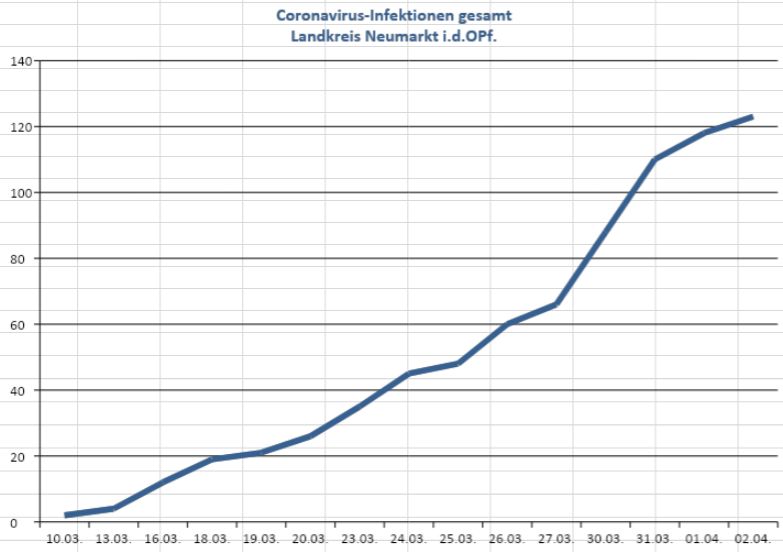 Die Gesamtzahl der bestätigten Fälle - also einschließlich der inzwischen wieder gesunden aber auch der beiden verstorbenen Menschen - liegt im Landkreis Neumarkt bei 123.