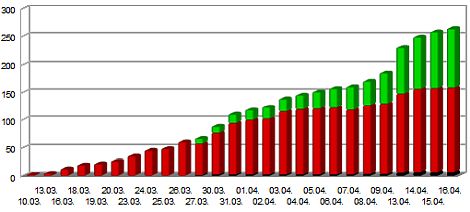 Unsere Grafik zeigt die Zahl der genesenen (grün), der aktuell infizierten (rot) und der verstorbenen Menschen (schwarz)