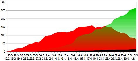 Diese Grafik zeigt die (nicht addierte) Einzelentwicklung für aktuell infizierte (rot), wieder genesene (grün) und verstorbene (schwarz) Menschen in den letzten acht Wochen