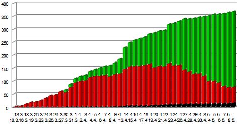 Zum Verständnis: die von der Oberkante der grünen Balken gebildete Kurve steigt zwangsläufig immer weiter an oder bleibt bestenfalls stabil. Wichtig ist dagegen die Kurve, die von der Oberkante der roten Balken gebildet wird