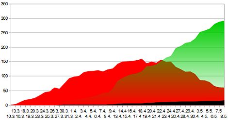 Unsere Grafik zeigt die Zahl der genesenen (grün), der aktuell infizierten (rot) und der verstorbenen Menschen (schwarz).