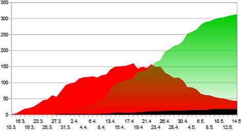 Unsere Grafik zeigt die Zahl der genesenen (grün), der aktuell infizierten (rot) und der verstorbenen Menschen (schwarz).