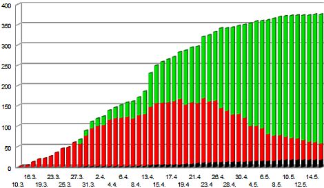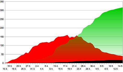 Unsere Grafik zeigt die Zahl der genesenen (grün), der aktuell infizierten (rot) und der verstorbenen Menschen (schwarz).