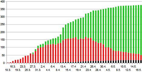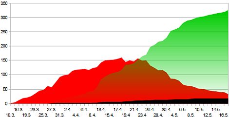 Unsere Grafik zeigt die Zahl der genesenen (grün), der aktuell infizierten (rot) und der verstorbenen Menschen (schwarz).