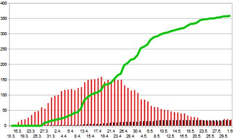 Die Balken zeigen die Zahlen der aktuell infizierten (rot) und der verstorbenen Menschen (schwarz) an. Die grüne Linie zeigt die Zahl der genesenen Menschen