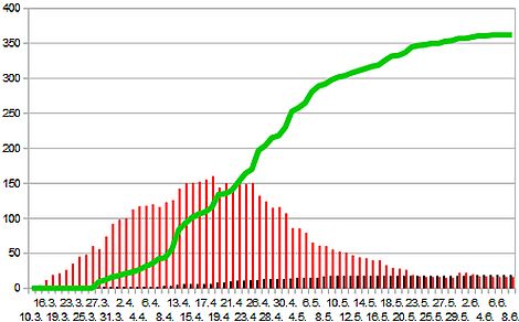 Die Balken zeigen die Zahlen der aktuell infizierten (rot) und der verstorbenen Menschen (schwarz) an. Die grüne Linie zeigt die Zahl der genesenen Menschen