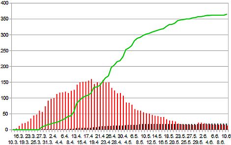 Auch am Mittwoch wurden keine neue Infektionsfälle im Landkreis Neumarkt bestätigt. Die Balken zeigen die Zahlen der aktuell infizierten (rot) und der verstorbenen Menschen (schwarz) an. Die grüne Linie zeigt die Zahl der genesenen Menschen