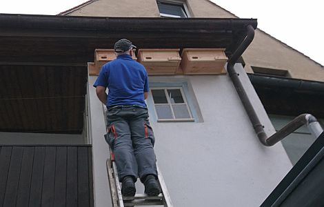 Deshalb sei es ein wichtiger Beitrag zur Erhaltung dieser faszinierenden Vogelart, ihnen an Gebäuden Nisthilfen in Form von Holzkästen oder speziellen Mauersteinen anzubieten. Den Wunsch, diese schon auf der roten Vorwarnliste stehenden Art zu unterstützen, hatte Dr. Anja Keil an ihrem Haus in der Klostergasse. Der Neumarkter Bund Naturschutz unterstützte diese Aktion: Kurt Ehrenreich montierte die komfortablen Unterkünfte in schwindelnder Höhe in ihrem Hinterhof.