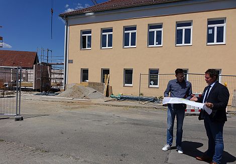 Die Arbeiten für den „Bürgertreffs“ liegen gut im Zeitplan: mit einer Eröffnung ist im Spätherbst 2021 zu rechnen. Der Altbau wird dabei entkernt und mit einem Anbau versehen, in dem das Treppenhaus und ein Aufzug zur barrierefreien Erschließung untergebracht sind. Außerdem besteht die Maßnahme aus dem Neubau für einen multifunktionalen Veranstaltungsraum mit einem Fassungsvermögen von bis zu 190 Personen. Auch die Neugestaltung des Dorfplatzes gehört mit dazu.
