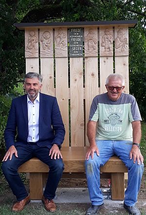 Auf der mit Schnitzereien reich verzierten Bank heißt es „Friede den Kommenden, Freude den Bleibenden, Segen den Scheidenden“.
