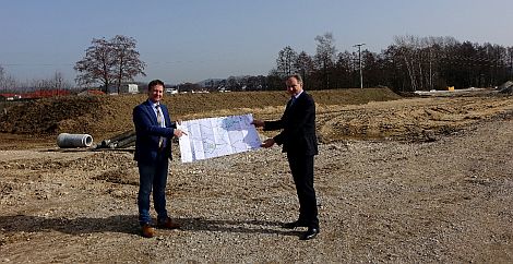 OB Thomas Thumann und Werner Schütt auf der Baustelle des neuen Hochwasserrückhaltebecken