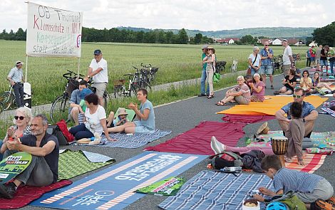 Unter Federführung der Bürgerinitiative „Genug davon B299“ hatte das Aktionsbündnis B299 zu einer Kundgebung an der Rittershofer Straße eingeladen. Mit einem Teppich aus Bannern, Isomatten, Picknickdecken, Tüchern, Transparenten und Fahnen protestierte man gegen die derzeitigen Planungen. Über 200 Neumarkter Bürger waren dieser „Welturaufführung“ gefolgt, denn hier wurde die Straße „tapeziert“, die nach den Vorstellungen der Planer unter einer Auffahrtsrampe für eine Brücke über die B299 verschwinden soll.