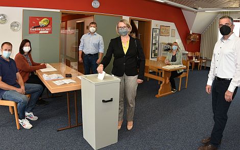 CSU-Kandidatin Susanne Hierl gab als aussichtsreichste Direktkandidatin am Sonntag zusammen mit ihrem Ehemann ihre Stimme im Gebäude der Freiwilligen Feuerwehr in Berg ab