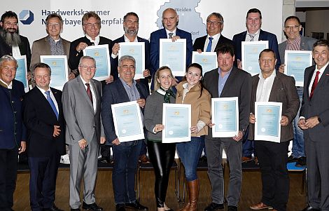 Metzgermeister Willibald Nießlbeck aus Berg und Landmaschinenmechanikermeister Xaver Platzer aus Neumarkt erhielten in der Handwerkskammer in Regensburg zusammen mit zehn weiteren verdienten Ausbildern aus Niederbayern und der Oberpfalz eine Ehrenurkunde des Bayerischen Wirtschaftsministeriums. HWK-Präsident Dr. Georg Haber und Hauptgeschäftsführer Jürgen Kilger hoben in ihren Reden die besonderen Leistungen und Verdienste der geehrten Ausbilder hervor.