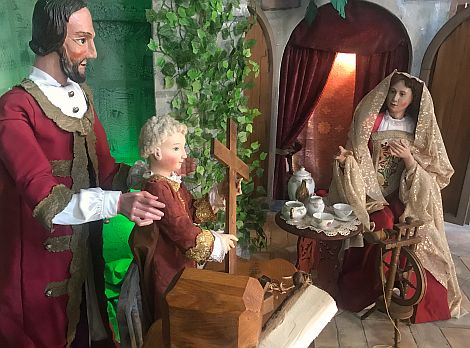 Maria ist fleissig am Spinnen und blickt staunend auf die offene Werkstatt ihres Mannes Josef. Der wundert sich seinerseits, was der kleine Jesus in seiner Holzwerkstatt gebastet hat: ein hölzernes Kreuz.