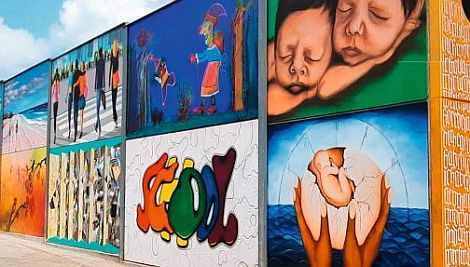 Nicht weit davon entfernt sind großformatige und farbkräftige Bilder zu sehen, die aus einer früheren grauen Betonwand ein Gesamtkunstwerk machen sollen. Zwölf Neumarkter Künstler des Kunstkreises Jura haben dabei jeweils einen Lebensabschnitt mit ihrer ganz individuellen künstlerischen Handschrift verewigt.