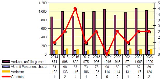 Die Zahl der Unfälle mit Verletzten stieg um 8,53 Prozent auf 89 Fälle. Dabei wurden zwei Menschen getötet und 124 verletzt, darunter 24 schwer. Der Gesamtschaden bei Sachschaden-Unfällen stieg leicht an und betrug über 1.597.000 Euro.