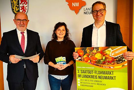 Landrat Willibald Gailler, Regina-Regionalmanagerin Corinna Frankerl und OB Markus Ochsenkühn stellte das Programm des Saatgut-Flohmarkt vor