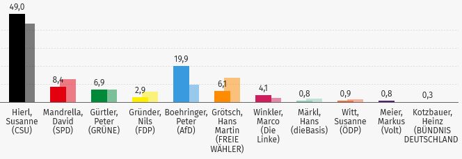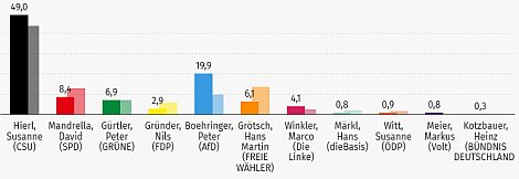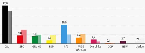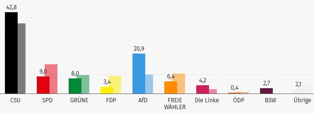 Die CSU steigerte sich von 36,8 Prozent auf 42,8 Prozent, konnte damit aber bei weitem nicht mehr die Ergebnisse der Bundestagswahlen von 2017 (46 Prozent) oder gar von 2013 (57 Prozent) erreichen.