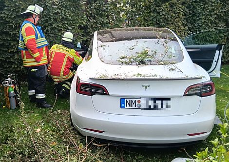 Nachdem die Autos miteinander kollidierten kamen beide nach rechts von der Fahrbahn ab. Der Wagen des 48jährigen Fahrers überschlug sich und blieb auf dem Fahrzeugdach auf dem Rad- und Fußweg liegen. Das Auto des 20jährigen Fahrers geriet über den Rad- und Fußweg hinweg in ein angrenzendes Grundstück und kam dort an einer Gartenmauer zum Stehen.