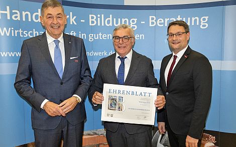 HWK-Präsident Dr. Georg Haber und Geschäftsführer Alexander Stahl überreichten die Ehenblätter im Rahmen einer feierlichen Veranstaltung in der Handwerkskammer in Regensburg.