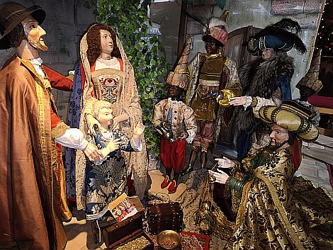 Diese Vorstellung ist der Höhepunkt einer jeden Jahreskrippe. In der Bibel steht ja nirgends, dass es Könige gewesen sind, und ihre Dreier-Zahl ist nicht gesicherter Fakt, sondern symbolisch zu sehen. Der junge Mohrenkönig Caspar, der greise Melchior und Balthasar symbolisieren die drei Lebensalter. Sie vertreten auch die drei damals bekannten Kontinente. Deshalb gibt es vereinzelt in der barocken Krippe einen vierten (Indianer-)König, denn mittlerweile ist ja Amerika längst entdeckt worden.