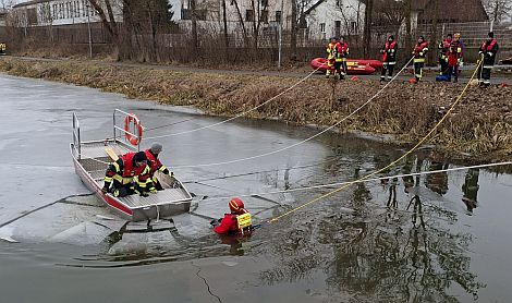 Beim Gemeinschaftstraining am alten Hafen des Ludwig-Donau-Main-Kanals in Neumarkt musste zur realistischen Übung ein „Opfer“ tatsächlich ins eiskalte Wasser.