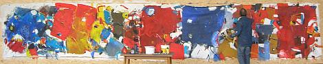 Dieses Riesenbild in Acryl wird an diesem Abend als Bildaufschnitt vor Ort in Stücken verkauft. Jeder kann sich seine Lieblingssequenz, seine Lieblingsecke aus dem Bild aussuchen. Gewählt werden kann in der Größe 53 Mal 53 Zentimeter oder in einem Vielfachen dieses Rasters. Als Quadrat, als Rechteck, senkrecht oder waagerecht.. einfach aussuchen, welcher Teil des Bildes einem am besten gefällt und ausschneiden lassen. Der Preis richtet sich nach der Rasteranzahl.