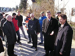Die Straßensperre wird weggeräumt: Stadtbaumeister Müller-Tribbensee, Polizei-Sprecher Josef Schmid, OB Thomas Thumann, Straßenbauamts-Chef Dr. Wolfgang Wüst, der für den Landkreis Neumarkt zuständige Abteilungsleiter Josef Gilch und Martin Hollweck vom Tiefbauamt der Stadt.