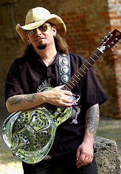 und spielt u.a. dreckige High-Energy-Slide-Guitar auf der Dobro als wäre der Teufel