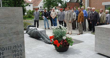 OB Thumann und Vertreter der Kriegerkameradschaft vor dem Kriegerdenkmal in Woffenbach