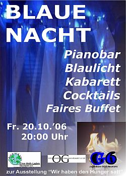NEUMARKT. Als Kooperationsveranstaltung des Ostendorfer Gymnasiums vertreten durch Thomas Röll, dem Eine-Welt-Laden Neumarkt, vertreten durch Ruth Dorner, und dem Jugendbüro der Stadt Neumarkt, vertreten durch Andreas Meyer findet am Freitag um 20 Uhr im Internetcafe G6 die "Blaue Nacht" statt.