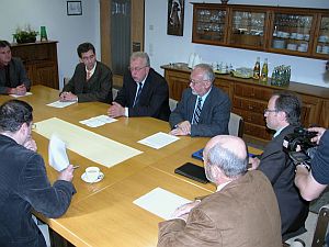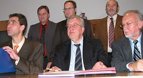 Bei der Unterzeichnung: Dr. Tobias Böcker, Landrat Albert Löhner, Rüdiger Cedl (sitzend v.l.), Michael Gottschalk, Hans Ried und Willibald Lenz vom Landratsamt (stehend).