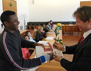 Oberbürgermeister Thumann wünschte den Teilnehmern für die am Dienstag beginnenden zweitägigen Prüfungen alles Gute und versprach, dass er die Daumen drücken werde. Er hoffe, dass sich der Weg der Teilnehmer auch für die Zeit nach dem Kurs positiv entwickeln werde. Denn sie hätten ihn mit ihrer engagierten und offenen Art sehr beeindruckt. Ihr eifriges Bemühen und die großen Fortschritte seien unverkennbar, sagte er.