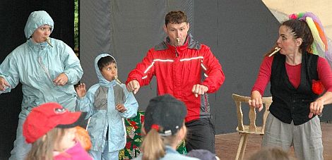 Der feuchte Gruß von oben hatte sogar noch seine guten Seiten: das Theatervölkchen brauchte nicht vor der Bühne zu sitzen, sondern durfte auf ihr, mitten im Geschehen, Platz nehmen. Das erleichterte den Kontakt zwischen der Pantomimin Ingrid Irrlicht und ihren Mitspielern, denn sie bezog ihre begeisterungsfähigen Zuschauer mit in ihr Programm ein.