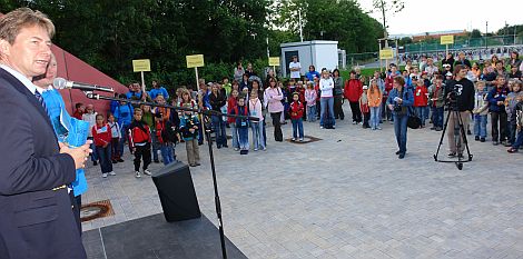 Oberbürgermeister Thomas Thumann begrüßt die "Kinderkünstler", die in ihren Ferien kreativ sein wollen.