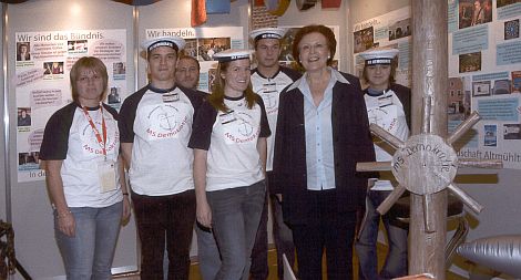 Die "Crew der MS Demokratie" und die Ministerin: Carolin Braun, Oliver Daller, Gerd Lindl, Juliane Braun, Andreas Haußner, Heidemarie Wieczorek-Zeul und Matthias Meier (von links) am Stand in Hamburg.
