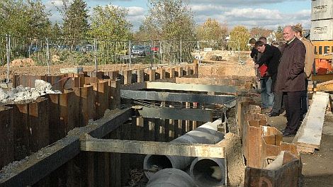 Die beiden "dünneren" Röhren laufen auf die "dickere" (vorne) zu, die im nächsten Schritt zusammengeschlossen werden. An der Baugrube überzeugen sich Stadtbaumeister Rudolf Müller-Tribbensee und Oberbürgermeister Thomas Thumann von der bisher geleisteten Arbeit.
