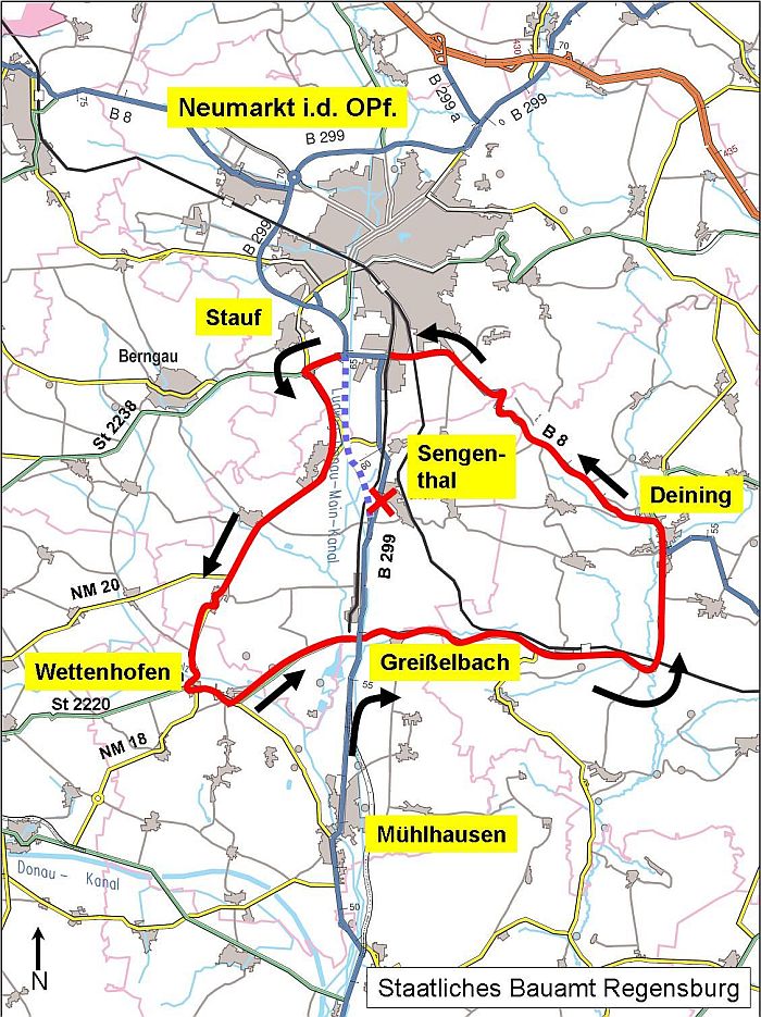 Für diesen Zeitraum sind Umleitungsstrecken ausgeschildert. Die Umleitung in Richtung Neumarkt führt ab Greißelbach-Kreuzung über die Staatsstraße 2220 nach Deining und von dort weiter über die Bundesstraße 8 nach Neumarkt.