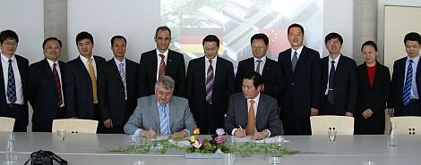 Vorstandsvorsitzender Dr.Ing. E.h. Hans Huber und der Geschäftsführer der "Shenzhen Nanshan Power Cooperation", Fu Bo, bei der Vertragsunterzeichnung