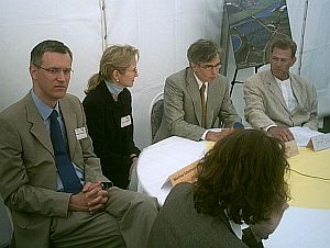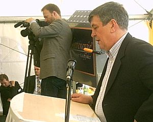 Stürmisches Wetter aber immerhin doch der eine oder andere Sonnenstrahl durch den wolkenverhangenen Himmel bildeten die Kulisse für die Feierlichkeiten unweit von Mühlhausen. Während die Spitzen der Wirtschaft komplett erschienen waren, machte sich die erste Garnitur der Politik allerdings rar. Umweltminister Schnappauf hatte schon einige Tage vor dem Termin abgesagt, Innenstaatssekretär Georg Schmid wurde bis Mittag auch nicht gesehen. Sogar Landrat Albert Löhner mußte sich von seinem Stellvertreter Willibald Gailer vertreten lassen.