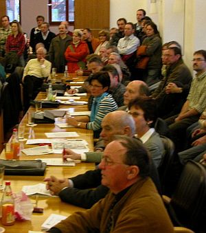 Außerdem wurde darüber nachgedacht, den 40 Stadträten die platzraubenden, aber für ihre Arbeit komfortablen Tische wegzunehmen und so viel Platz im Sitzungssaal zugewinnen. Doch das sei den Stadträten kaum zuzumuten, die schließlich Ablegeplatz für Akten oder andere Unterlagen brauchen.