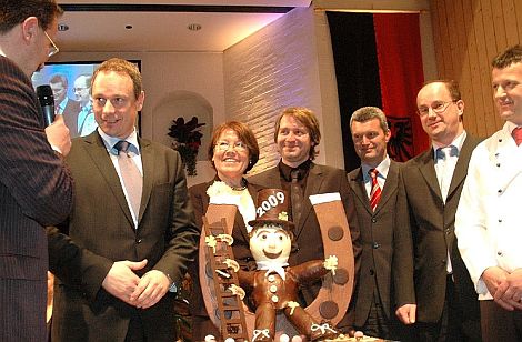 Mit einem Glück bringenden Marzipan-Hufeisen aus der Meisterhand von Norbert Wittl (rechts) bedankt sich der gesamte Vorstand des CSU-Stadtverbandes beim Bayerischen Finanzminister Georg Fahrenschon (2. von links) für seinen Besuch in Neumarkt.