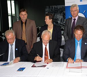 Landrat Löhner, Präsident Braun und OB Thumann unterzeich-