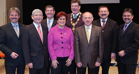 Gäste beim Neujahrsempfang in Mistelbach: Landtagsabgeordneter Karl Wilfing, Landtagspräsident a.D. Edmund Freibauer, Bezirkshauptmann Dr. Gerhard Schütt, Stadträtin Dora Polke, Bürgermeister Christian Resch, Stadtrat Heiner Zuckschwert,