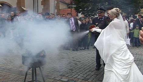 Beim Verlassen der Kirche - das selbst auferlegte Fotografierverbot der Journalisten war beendet - gratulierten zahlreiche Freunde dem Brautpaar. Auch den ersten Brand galt es zu löschen - den freilich die Neumarkter Feuerwehr eigens gelegt hatte, um ihrem Vorsitzenden und dessen Eehefrau vor die erste Bewährungsprobe zu stellen.