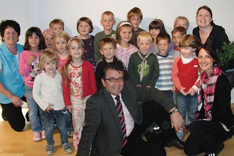 Zum Schluss erhielten die Kleinen noch eine kleine Brotzeit und die Erzieherinnen bedankten sich für die interessante Rathausführung. Die Kinder revanchierten sich mit einer selbstgebastelten Blumenkette. Die hängte der Bürgermeister sofort in sein Amtszimmer.