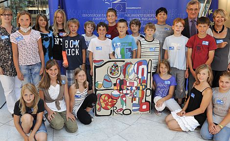 Der Anlass: Im Kunstunterricht wurde ein farbenfrohes Bild über Europa erstellt, das den Titel "Europa kunterbunt" trägt und an Albert Deß überreicht wurde. Die Reise der Schulklasse wurde durch die Stadt Velburg mit ihrem Bürgermeister Bernhard Kraus unterstützt.
